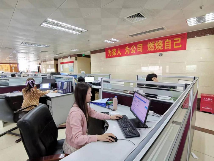 在總部,在“為家人,為公司,燃燒自己”的醒目標語下,工作人員各司其職,伏案工作。